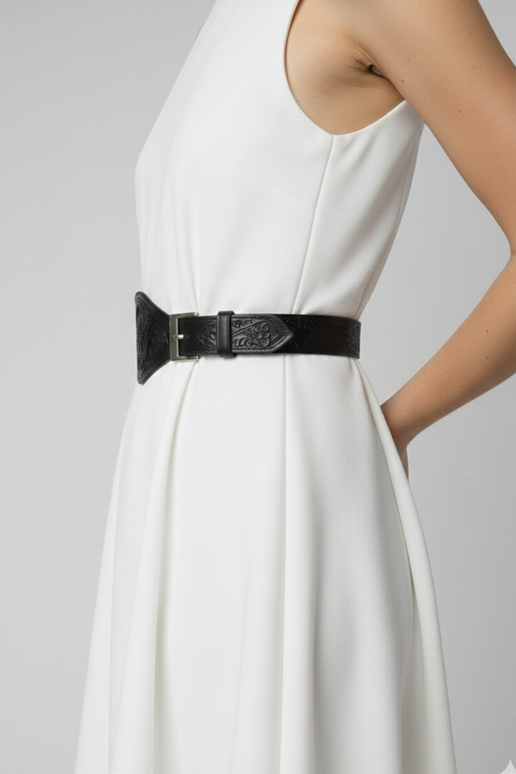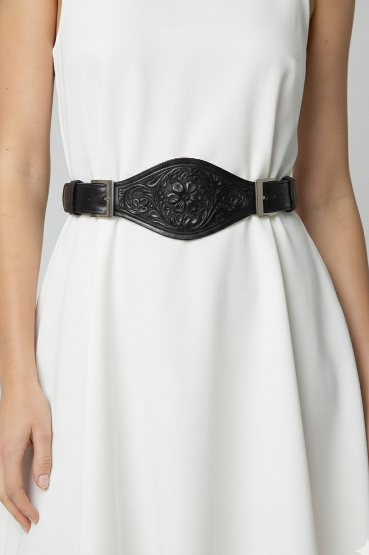 - Cinturón trabajado a mano en cuero de talabartería color negro