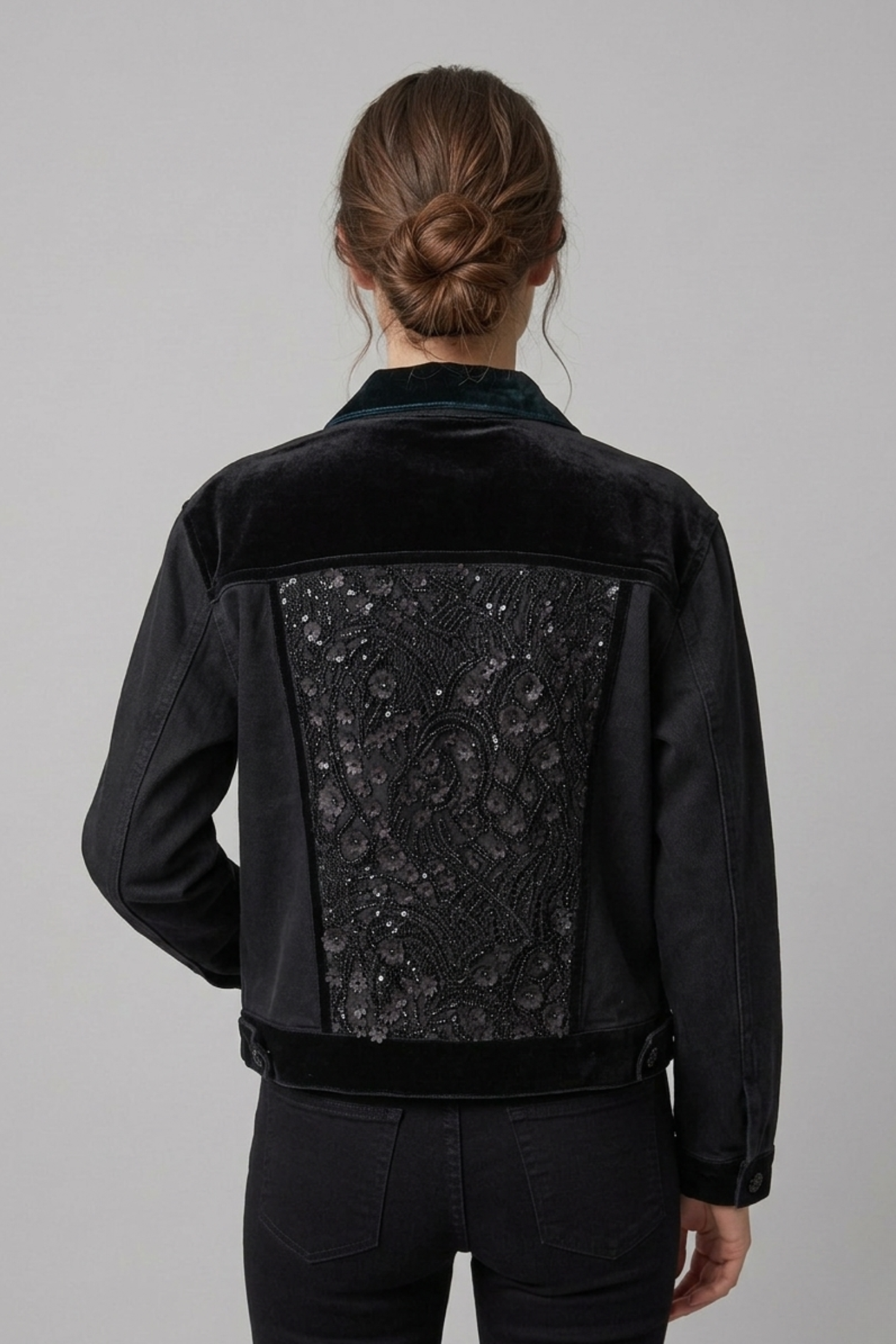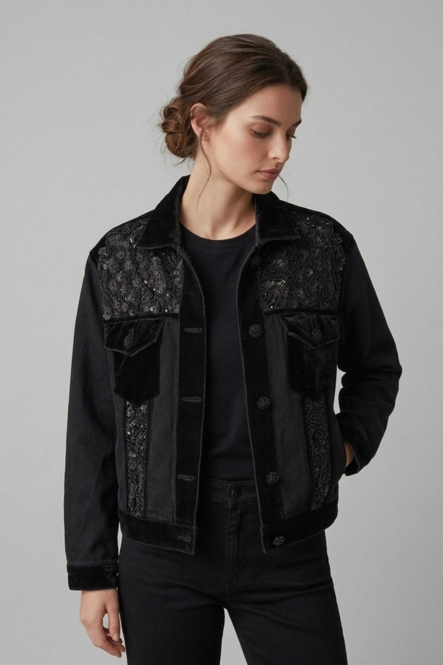 Casaca Fortuna | Denim Negro con Encaje, Cuero y Terciopelo